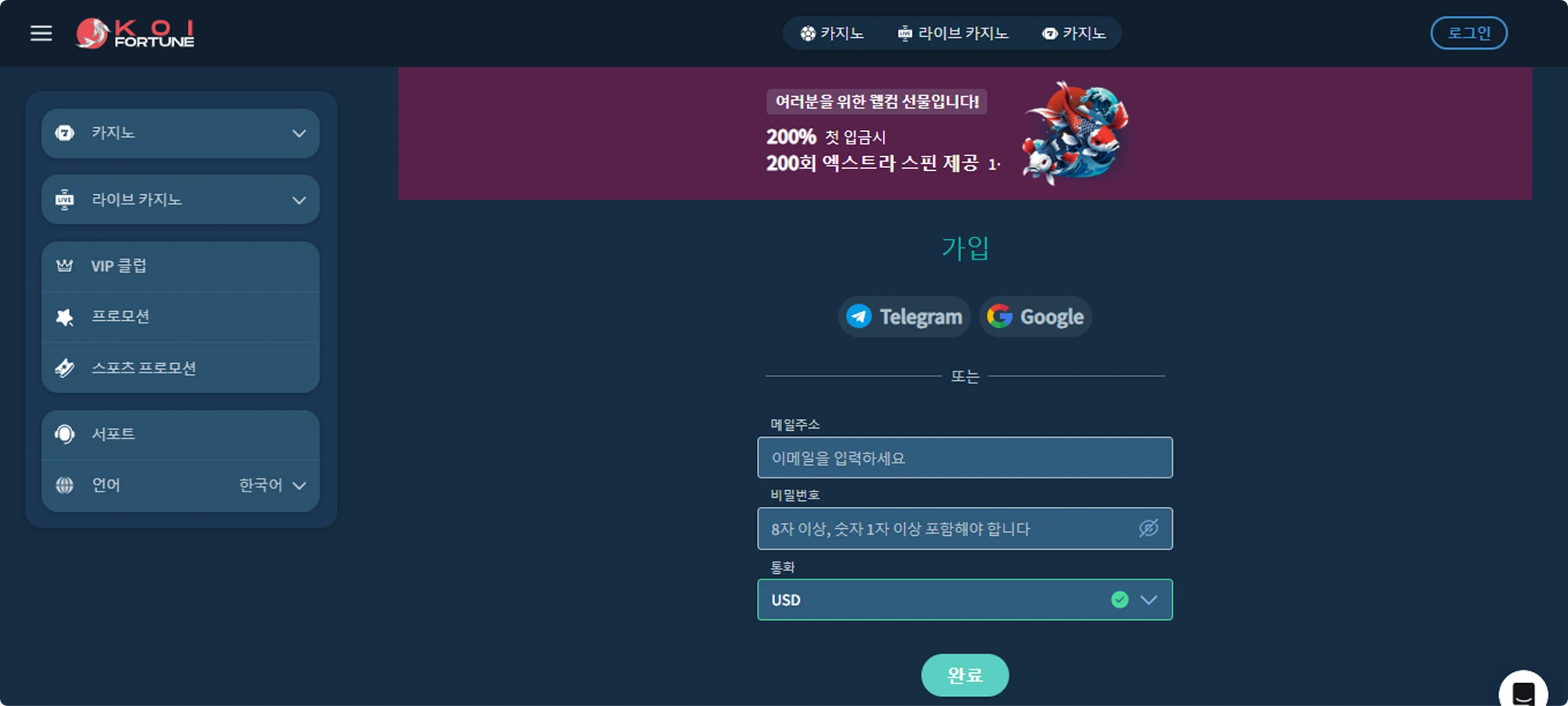 Koi Fortune에서는 카지노 여정을 클릭 몇 번만으로 간단하게 개시할 수 있습니다. 가입 절차가 하나도 복잡하지 않고 오히려 간단하죠. 여타의 베팅 플랫폼에서는 사용자들의 개인정보를 무단으로 수집하기 때문에 가입 시 귀찮을 정도로 많은 정보를 요구합니다. 하지만 Koi Fortune에서는 사용자 경험을 중요시하기 때문에 과도하게 정보를 요구하지 않습니다. 아래 스크린샷에서 알 수 있듯이 이메일과 비밀번호만 입력하면 끝이죠.